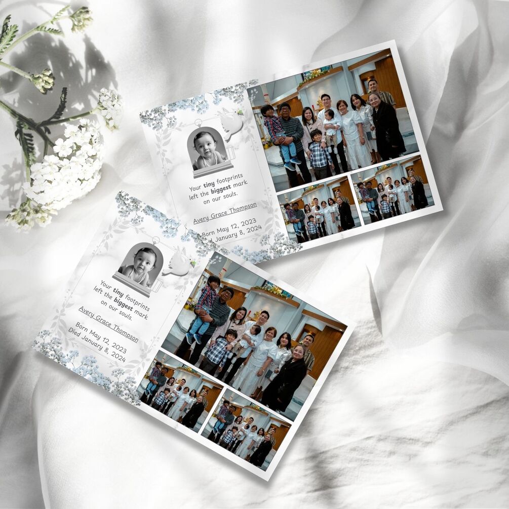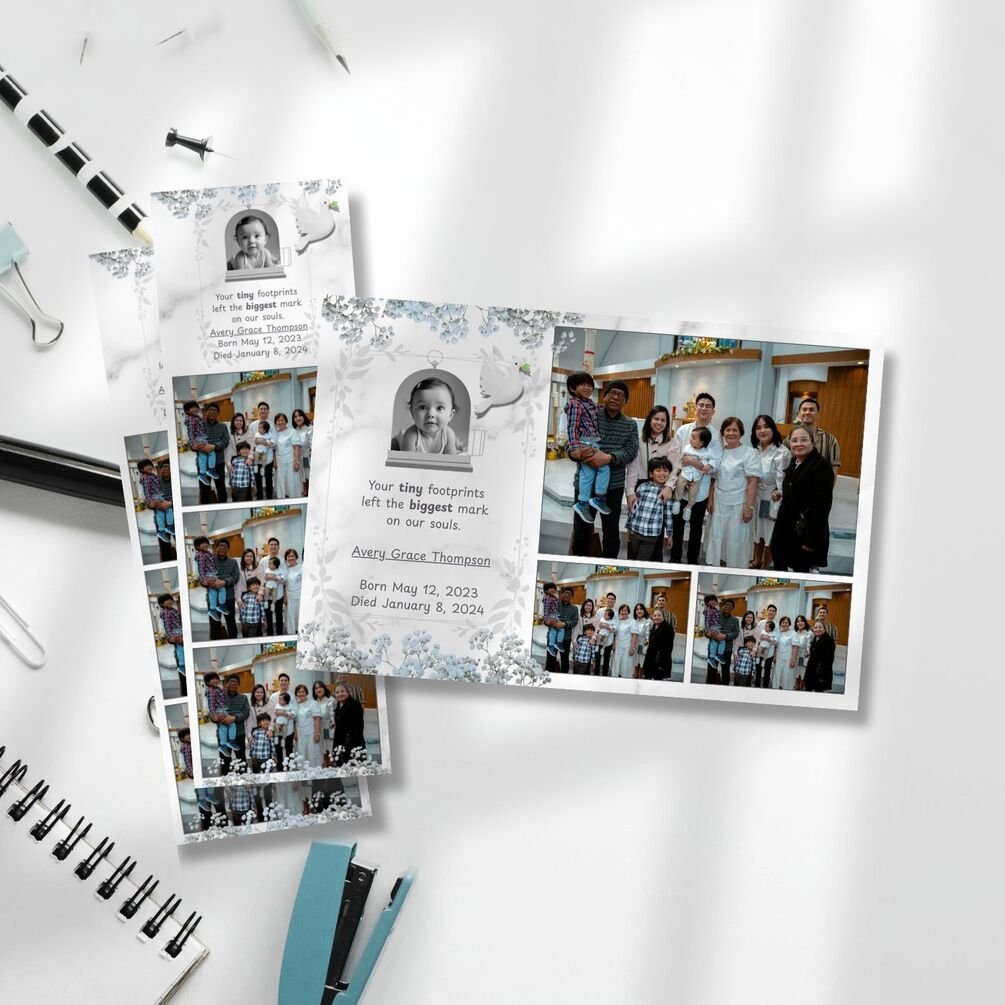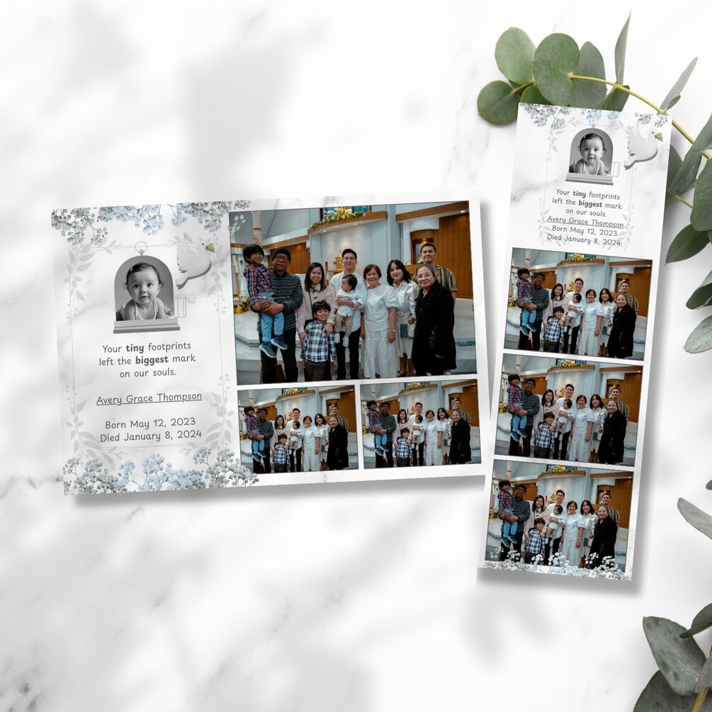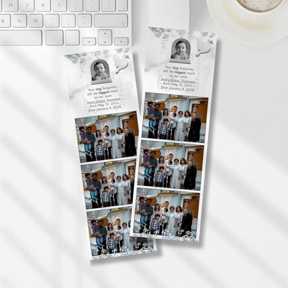 Honor the memory of your loved ones with this Memorial Photo Booth Template, featuring delicate florals, soft marble textures, and peaceful dove illustrations. This design creates a gentle, heartfelt atmosphere for remembering and celebrating the short but meaningful life of your beloved.