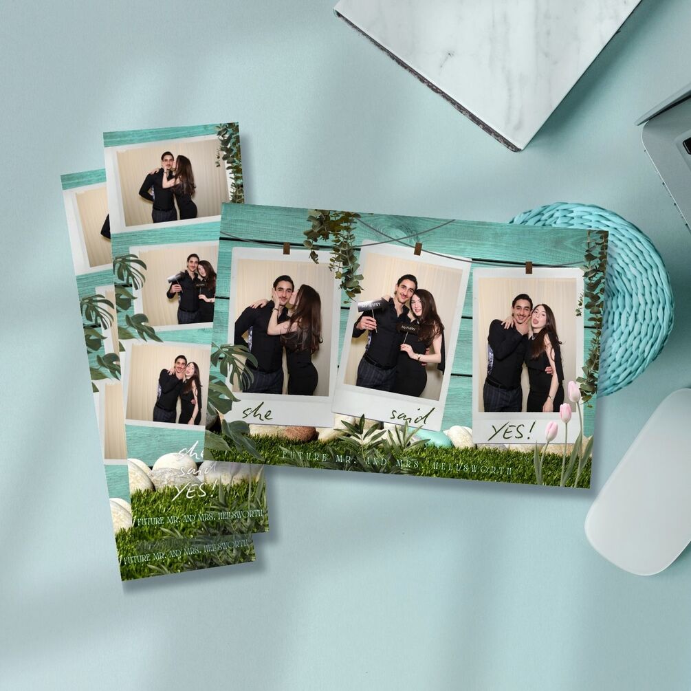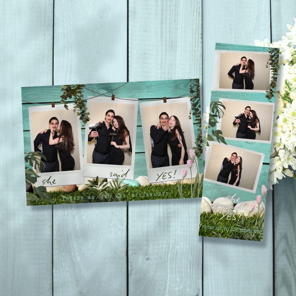 Say “Yes!” to unforgettable memories with this rustic engagement photobooth template 💍✨ Perfect for proposals, engagement parties, and bridal showers, this design features a teal wooden backdrop, greenery, and Polaroid-style frames for a charming, natural vibe.